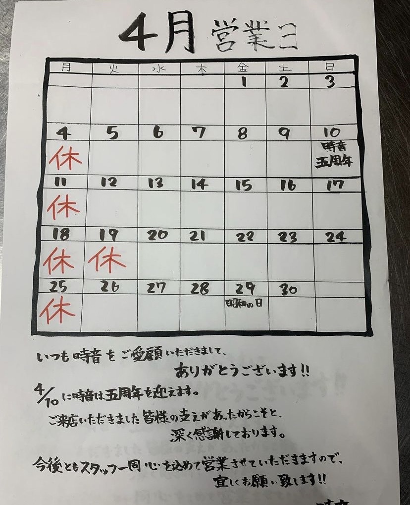Instagram Instagram Facebook Facebook ホームページ ホームページ 新着情報 2022/05/01 5月営業日 2022/05/01 GW特別メニュー ゴールデンウィーク特別メニューです!! 2022/04/14 北海道産無添加生ウニ 本日のオススメです!嫌なミョウバンの味はもちろんしません☆是非、この機会に♪ 2022/04/08 時音5周年 4/8(金)~4/10(日)の期間で周年祭を開催しております☆ご来店お待ちしております!! 2022/04/03 4月営業日 最初へ181920最後へ